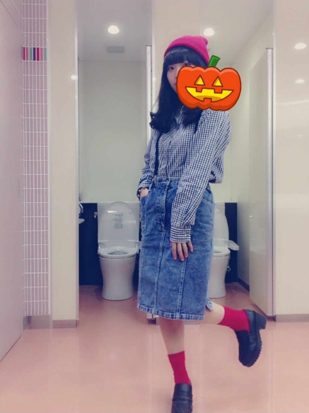 ニット帽/ダイソー トップス/古着屋 スカート/古着屋 サスペンダー/g.u. 靴下/チュチュアンナ 靴/WEGO トイレw