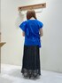 ご覧いただきありがとうございます! ブラウスは大きめフリルが1枚で華やかなコーディネートになります🪽🪽 お袖は短めで袖口も開いているので風通し良く涼しく着用できます! 鮮やかなブルーのお色味は今期人気色となっております🙌🏻💙 スカートはストンと落ちるシルエットかスッキリ見えます✦.*·̩͙ 150cmで足首くらいの丈ですが、足元は透け感あるデザインになっているので長さは気になりにくかったです😌