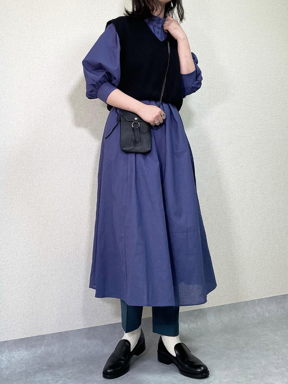 【 レイヤードコーデ 】 @korum_nugu のニットベストの着回しコーデ🧶 ワンピースは @andronlineshop さんの コットンリネンロングワンピース コットンリネンの素材で、ふわっとした シルエットでめっちゃかわいい🥺❣️ カラーも綺麗なネイビーブルー🤦🏻♀️