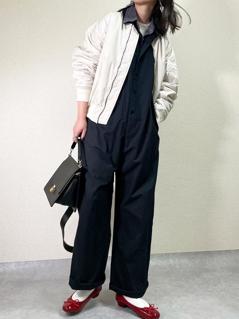 【 メンズライクコーデ 】 アウターは、 @arholiday さんの ma-1 アイボリー 丸みのあるシルエットで、使いやすい丈感◎ アイボリーは秋冬以外も使えそう🕺🏻🪖 しかも暖かくて、重宝する! 足元は赤バレエで女性らしく👧🏻 チェックシャツレイヤードするのお気に入り👔