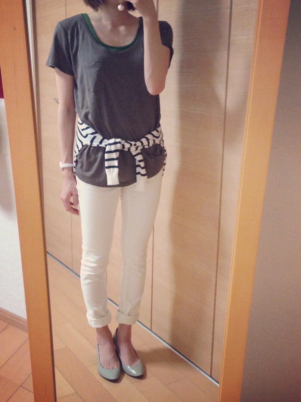 いつもながら、プチプラコーデ。 UNIQLOの白のパンツ…なかなかいいかんじで気に入ってます♪ 2900円のパンプスも、合わせやすい色☆
