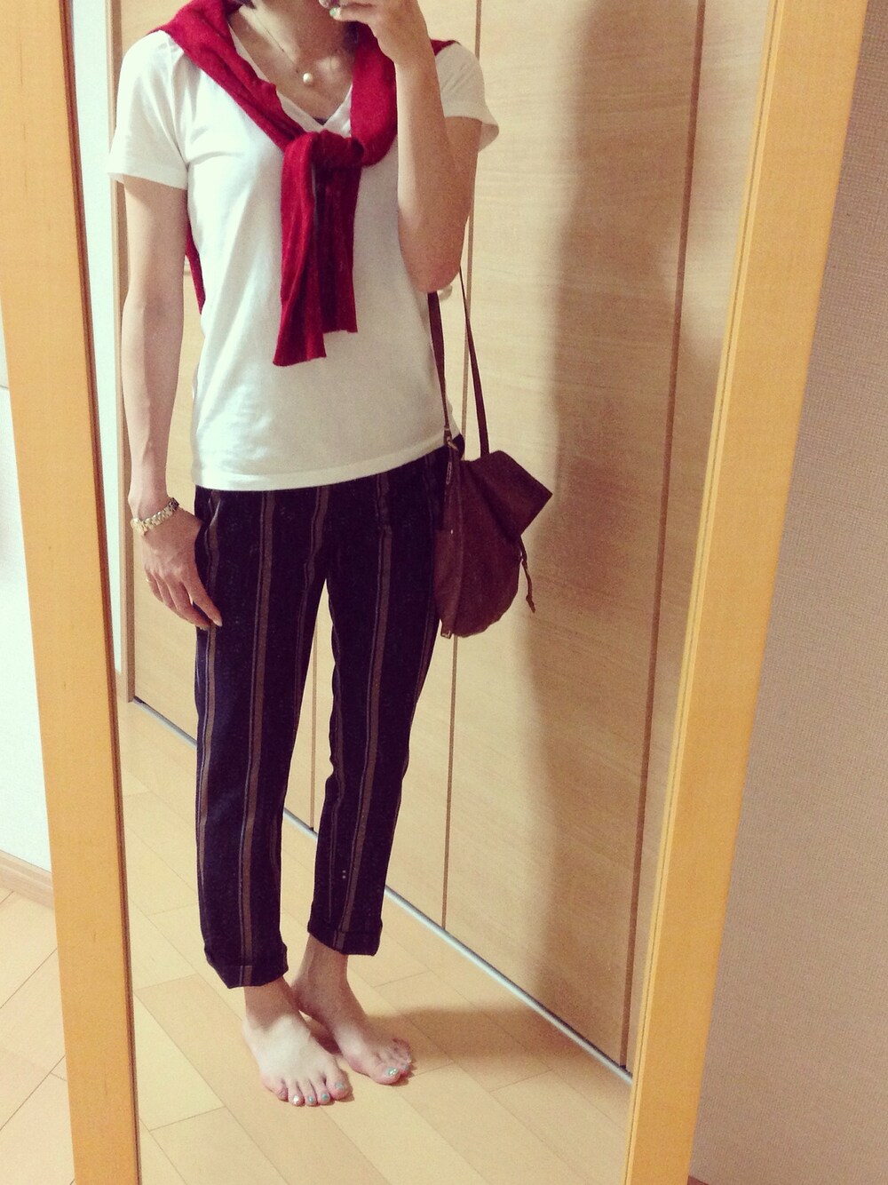 最近話題のUNIQLOのストライプパンツ。 履き心地抜群☆ 足元は、薄いグレーのパンプスを合わせました♪ それにしても、腕の血管の出方…女子の腕じゃないw