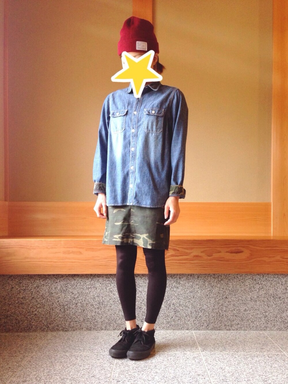 シャツの袖を折り返すとカモフラ柄。 スカートもカモフラでカモフラだらけになってしまった…w 今日はプチプラではない!w