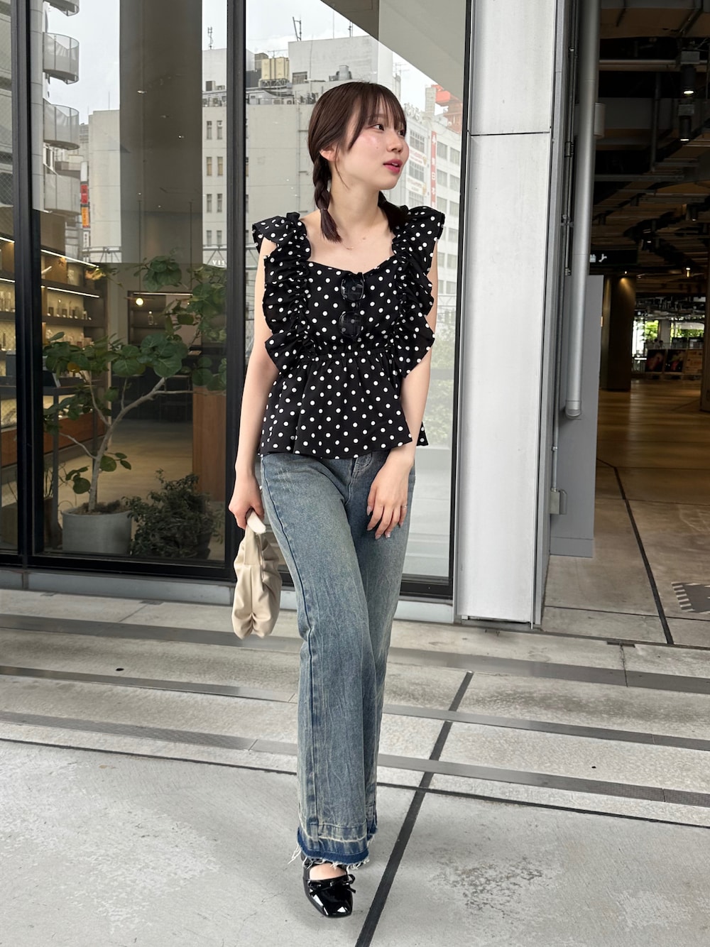 ドットのブラウスってとびきり可愛くなれるよね♡ウエストの切り替え位置が高めだから ウェーブさんには特におすすめなトップス! 腰位置高く見えてスタイル盛れる⭐️ 友達とお出かけにも🙆♀️デートにもドライブにも🙆♀️♡ もう少しキレイ目に着こなしたい方はデニムじゃなくてスラックスとかにしてつま先尖ったミュールにしてあげるといいかも!◎