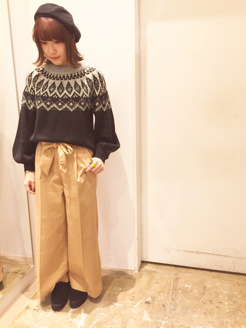 柄ニットで大人カジュアルに🖤 ノルディック柄が目を引くニット! お袖はトレンドのバルーンスリーブ になっており、シルエットにもこだ わっているアイテムです😌 ボトムはハイウエストとしても使える ウエスト部分が特徴的なワイドパンツ✨ トップス次第でカジュアルにもキレイめ にもお使いいただる万能パンツ👌🏻