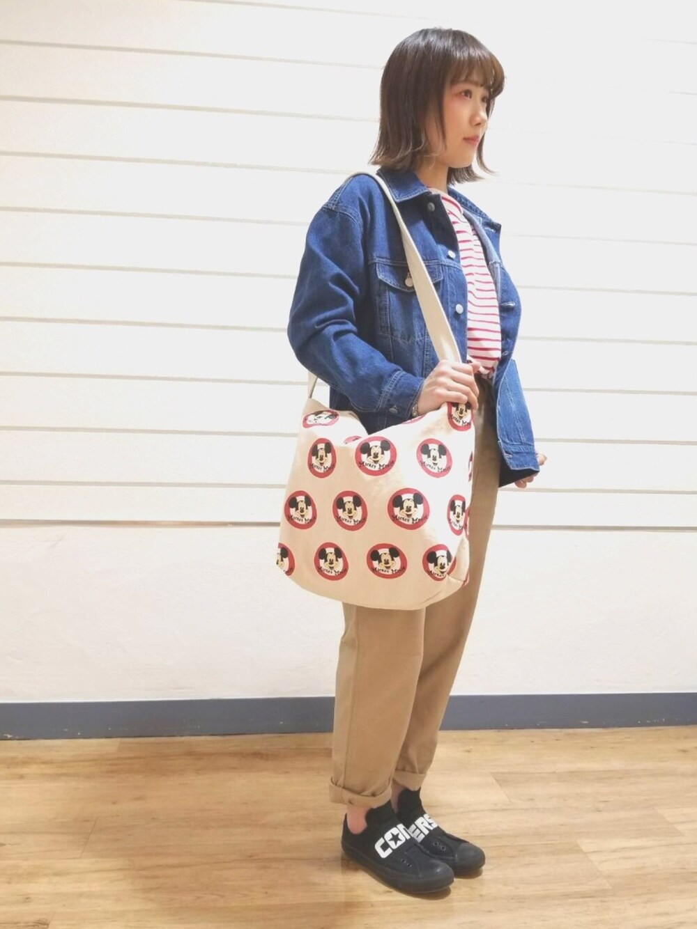 閲覧いただきありがとうございます🔍 春が近づいてきていますが、雨が 降ったりで天候が不安定ですね…💦 天候が変わりやすいこの時期は温度 調節ができるコーデがオススメです😆 Gジャンとチノパンというこの春の マストアイテムに赤をポイントで🍎 レトロ感のあるミッキーコラボの鞄 を持って遊び心もプラスしました🐭🌸