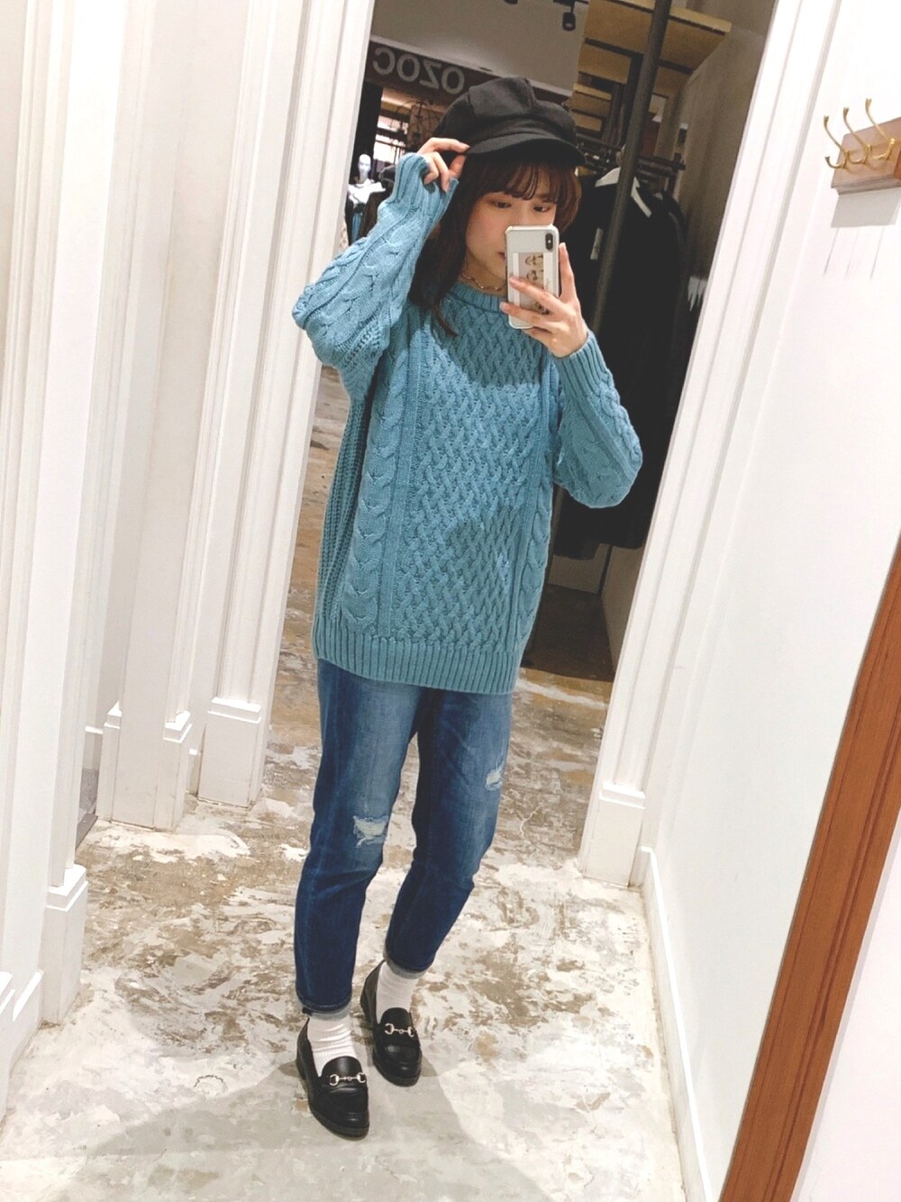 定番のケーブルニット☃ 定番アイテムも色味で印象がガラッと 変わります!! サックスブルーで今年らしい冬コーデに❄️ デニム×白ソックス×ローファーで ゆったりニットの重たさ軽減✌🏻️