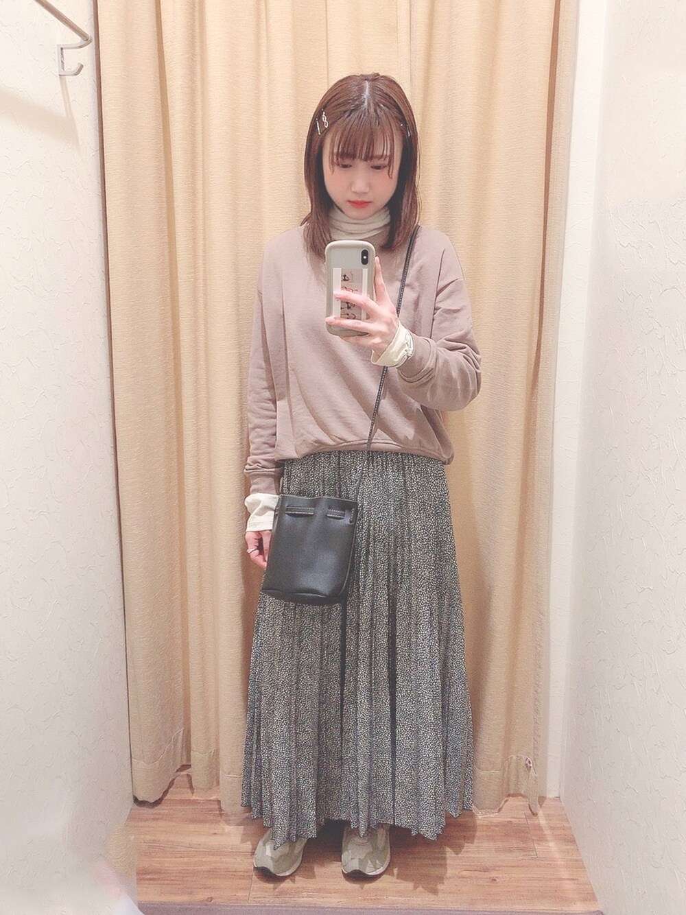 休日コーデ🐻 また寒くなってしまった😵 …そんな日はレイヤードスタイルで 寒さ対策+トレンド感を! トップスは柔らかい色合いで揃えて スカートは暗めの柄物を合わせると 落ち着きすぎず、シンプルなトップス も映えるコーデに👌🏻