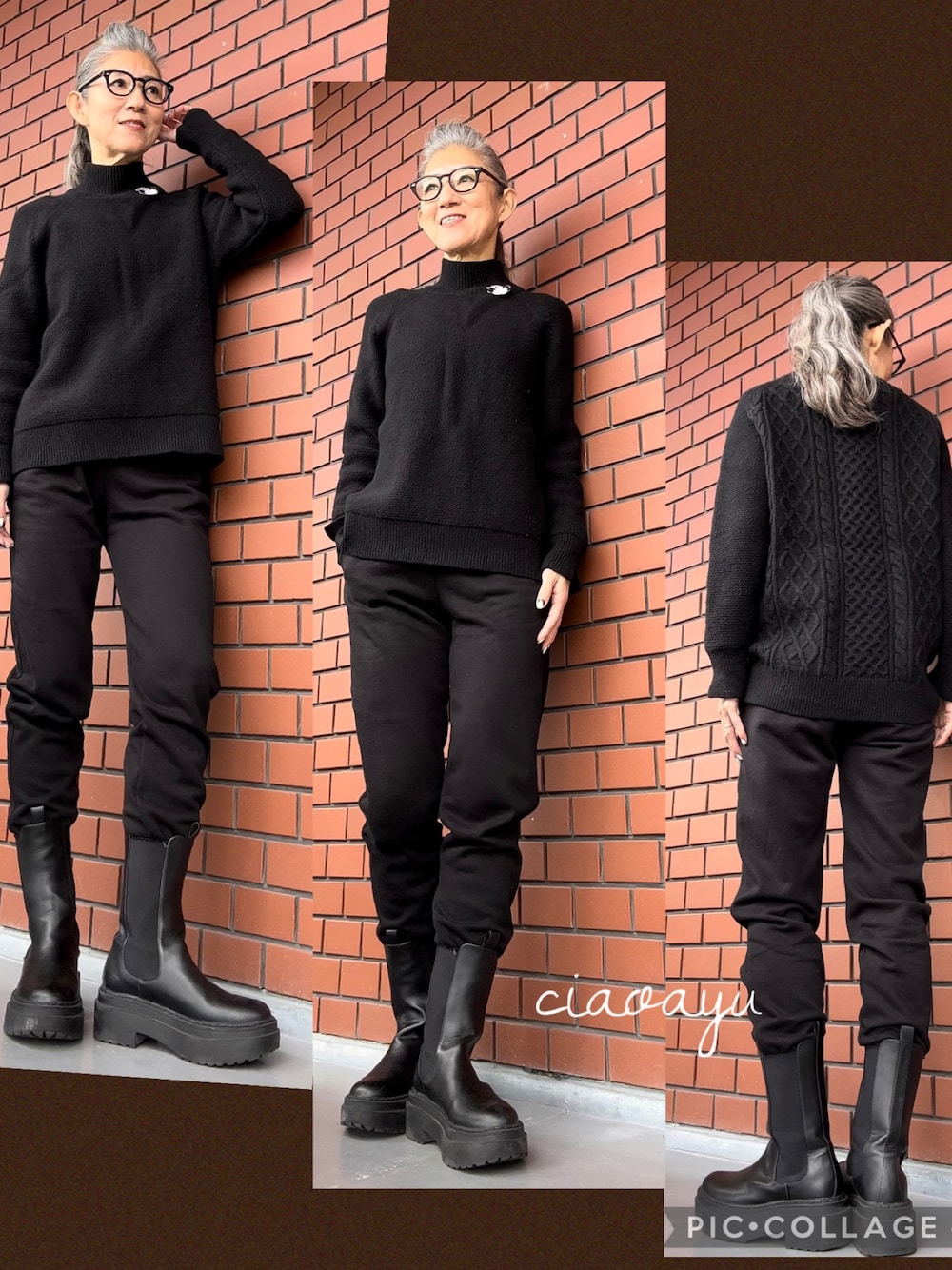 コーデはハイネックのニット、 昨年のUNIQLO +Jのもの。 ボトムはスウェット、 足元はサイドゴア。 襟元のワッペンブローチは 《ノーパンだ🐼》です