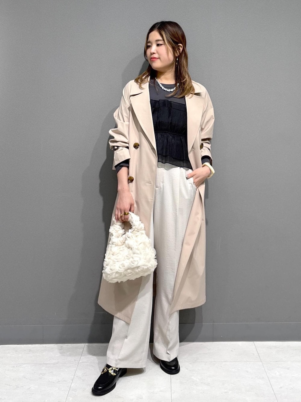 シンプルな色合いながらも、 デザイン性のあるトップスとバッグで華やかさをプラスしました。 トレンチコートは1着あると毎年トレンドに左右されずに 着られるのでおすすめです!