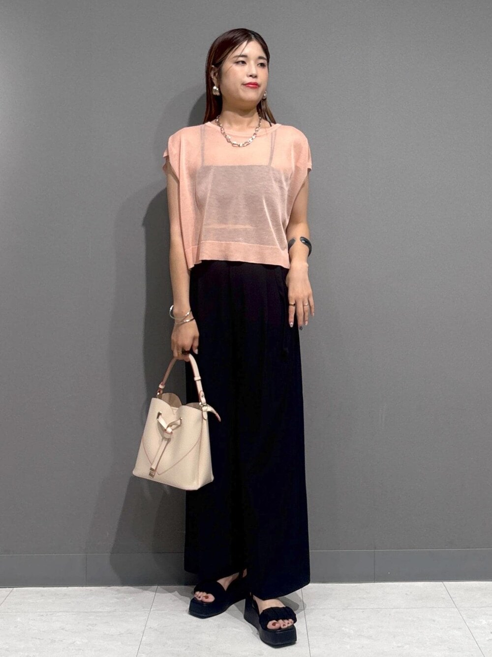 ピンク×ブラックの大人かっこいいコーデ。 ピンクのように肌の色に近いと透け感が目立ちすぎないので 大人の方でも挑戦しやすいです◎ ブラック合わせでかっこよく◎ ※記載のないものはスタッフの私物です。