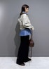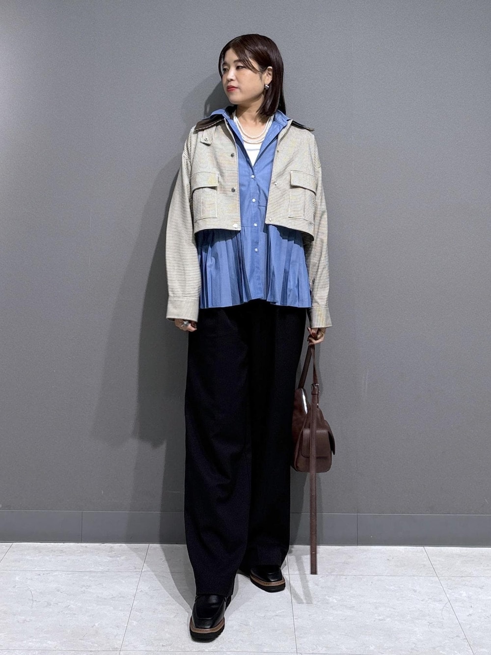 シャツとJKのレイヤードスタイル。 襟を強調して小顔効果◎ 空いた首周りにはパール3連で存在感を。 メンズっぽいスタイルには女性らしい小物でバランスを◎ ※記載のないものはスタッフの私物です。