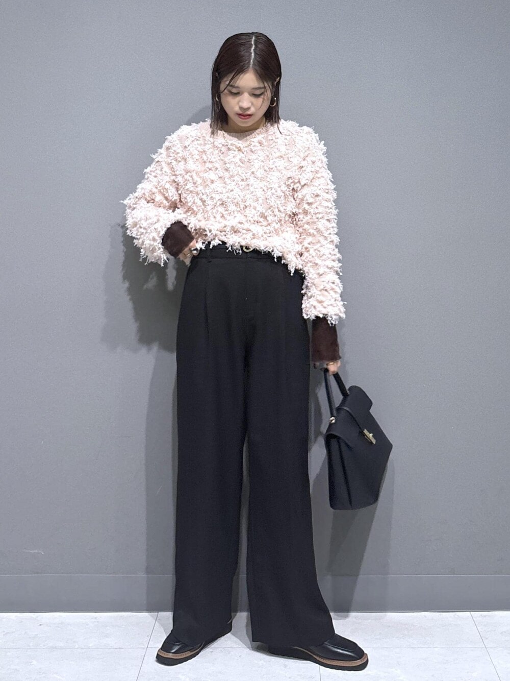 デザイン性◎のニットで着映えコーデ。 ニットが存在感◎なので、そのほかのアイテムはシンプルにしてバランスをとりました! ベロアインナーのレイヤードがポイント◎ ピンク×ブラックは大人かわいいの定番! ぜひ取り入れてみて下さい☺︎ ※記載のないものはスタッフの私物です。