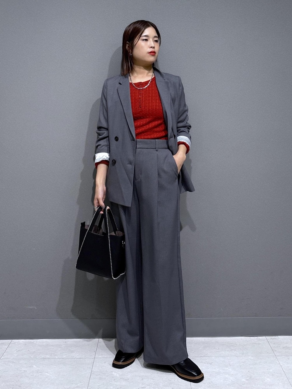 グレーのセットアップに ボルドーを合わせてシックな大人コーデに。 こなれ感を出したいときには ブラックではなくグレーがおすすめ◎ リップも深みのあるカラーにして インナーと合わせてみました☺︎ 新作のバッグはボールチェーンが施されていて高見え。 見た目はもちろん、実用性も◎でおすすめアイテム。 ※記載のないものはスタッフの私物です。