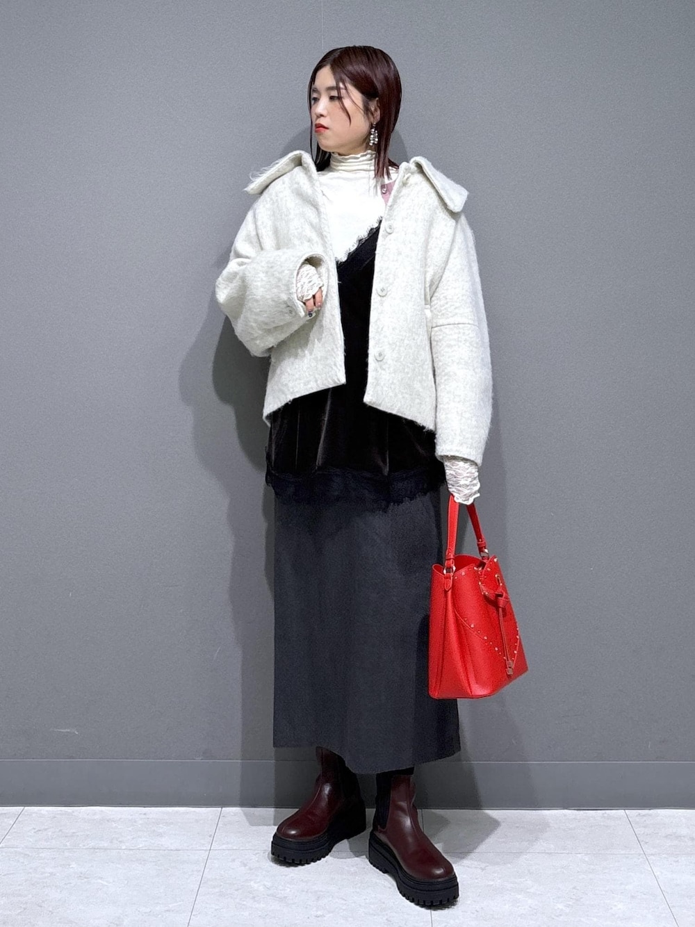 デートにはやっぱりホワイトのアウターがおすすめ♡ コロンとしたフォルムが女性らしくてかわいい◎ スカートのスリットでさりげなく肌見せも♡ ぜひ店頭でもお試し下さい☺︎ ※記載のないものは私物です。