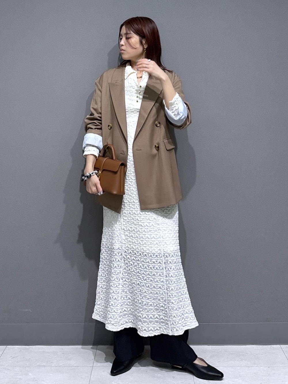 甘めレースなので ジャケットで大人カジュアルに。 オーバーサイズのジャケットにすることでラフなイメージ◎ オーバーサイズ×レイヤードは 高身長の方におすすめの着こなしです☺︎ ※記載のないものは私物です。