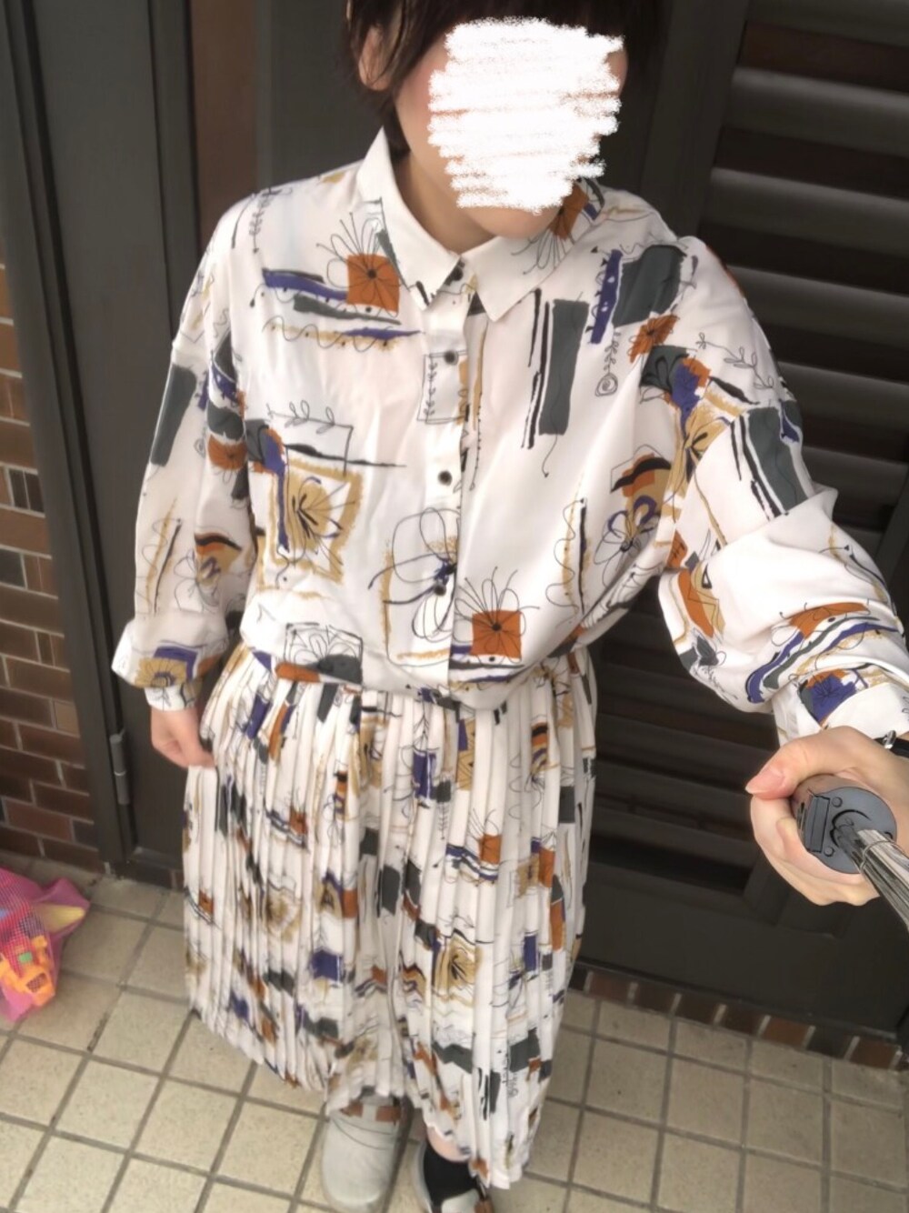 28回目です! 今日はカジュアル?こーで 雨で気温が長袖も着れそうだったので着れてなかったセットアップ風の服にしました 幾何学模様(多分)が可愛いくて速攻買いに走った〜🤩✨ こういうアートっぽい柄の服も好き😎 シャツとスカート別々に売られてたのでセットアップできたり片方だけで着れるのも良い😆✨ お靴はマーレの防水加工の靴🙂