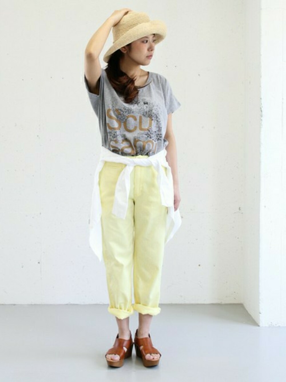 明るめのカラーリングがかわいいパンツの定番チノパン。ルーズでメンズライクなデザインのチノパンなので上品なブラウスや、ヒールなど女性らしいアイテムとのコーディネイトがオススメです。