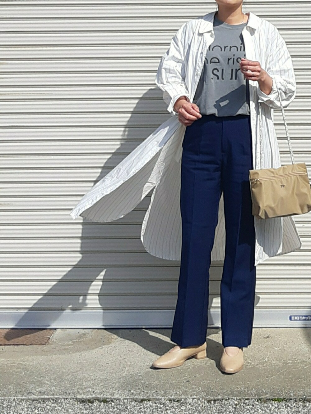 シャツワンピのストライプのベージュと、 バッグ、パンプスの色合わせてみました🙆