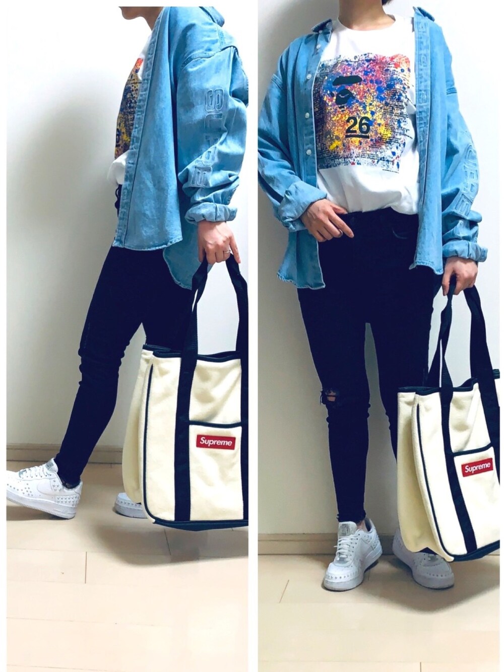 古着で買ったsupremeのデニムシャツ。暖かくなったら着ようと楽しみにしてました。 Tシャツ可愛くてお気に入り👚白だから汚してしまいそう…