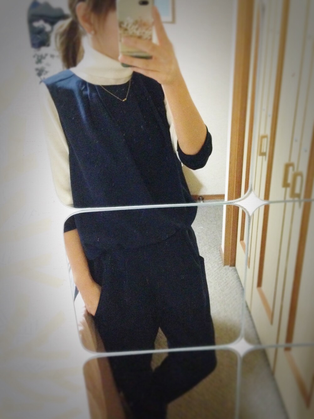 夏に買ったサロペットを引っ張り出しました☺︎ タートルネックはネイビーとのツートン。 GUで850円‼︎
