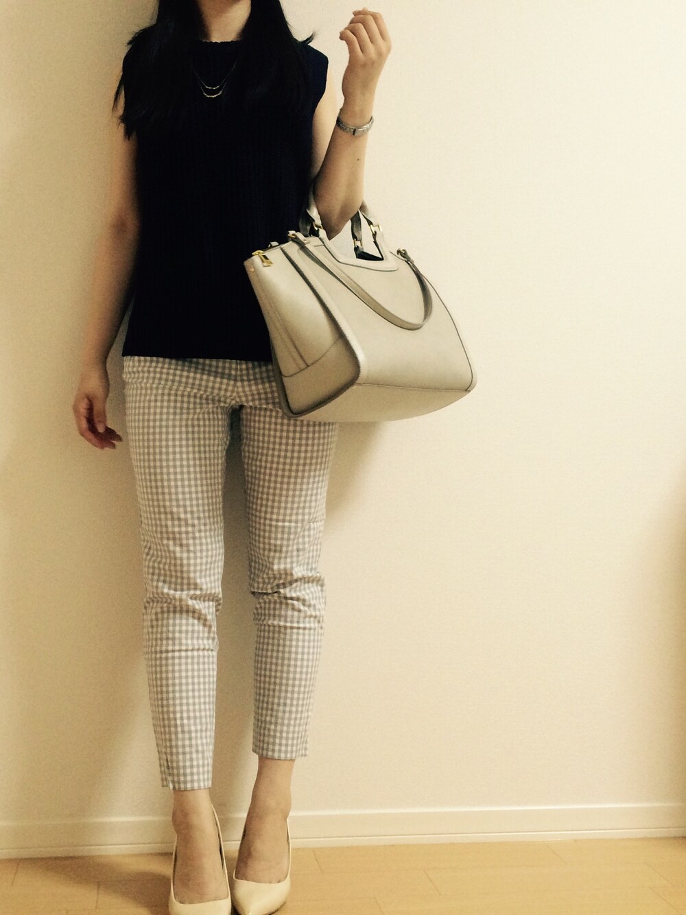 お仕事行くときのお洋服 グレーのギンガムチェックが可愛くてポイントです