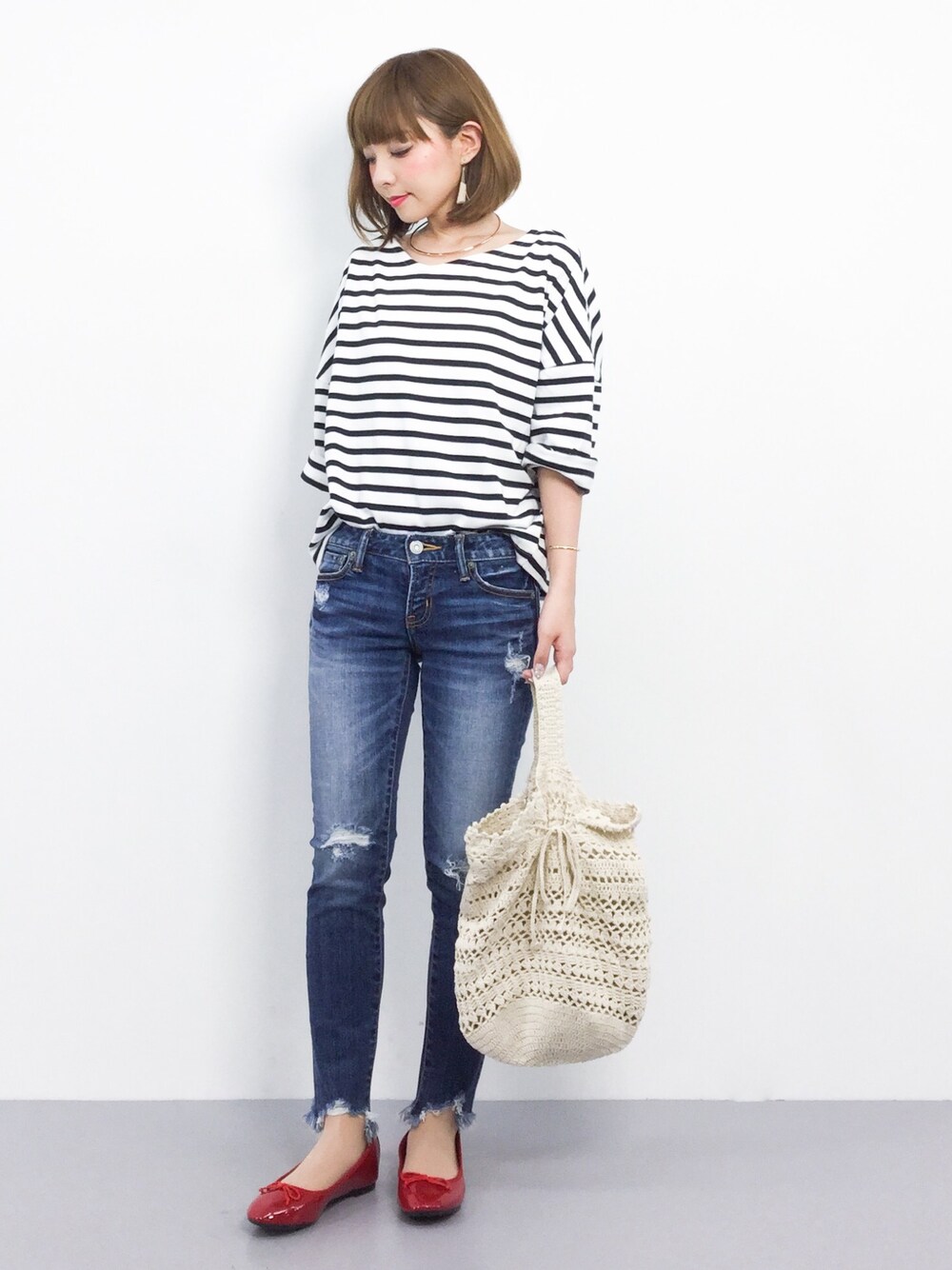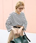 ayumi sato のTシャツ/カットソー「上質なカリフォルニアコットン素材◆2wayボーダービックシルエットドルマンスリーブ七分袖カットソー」を使ったコーディネート