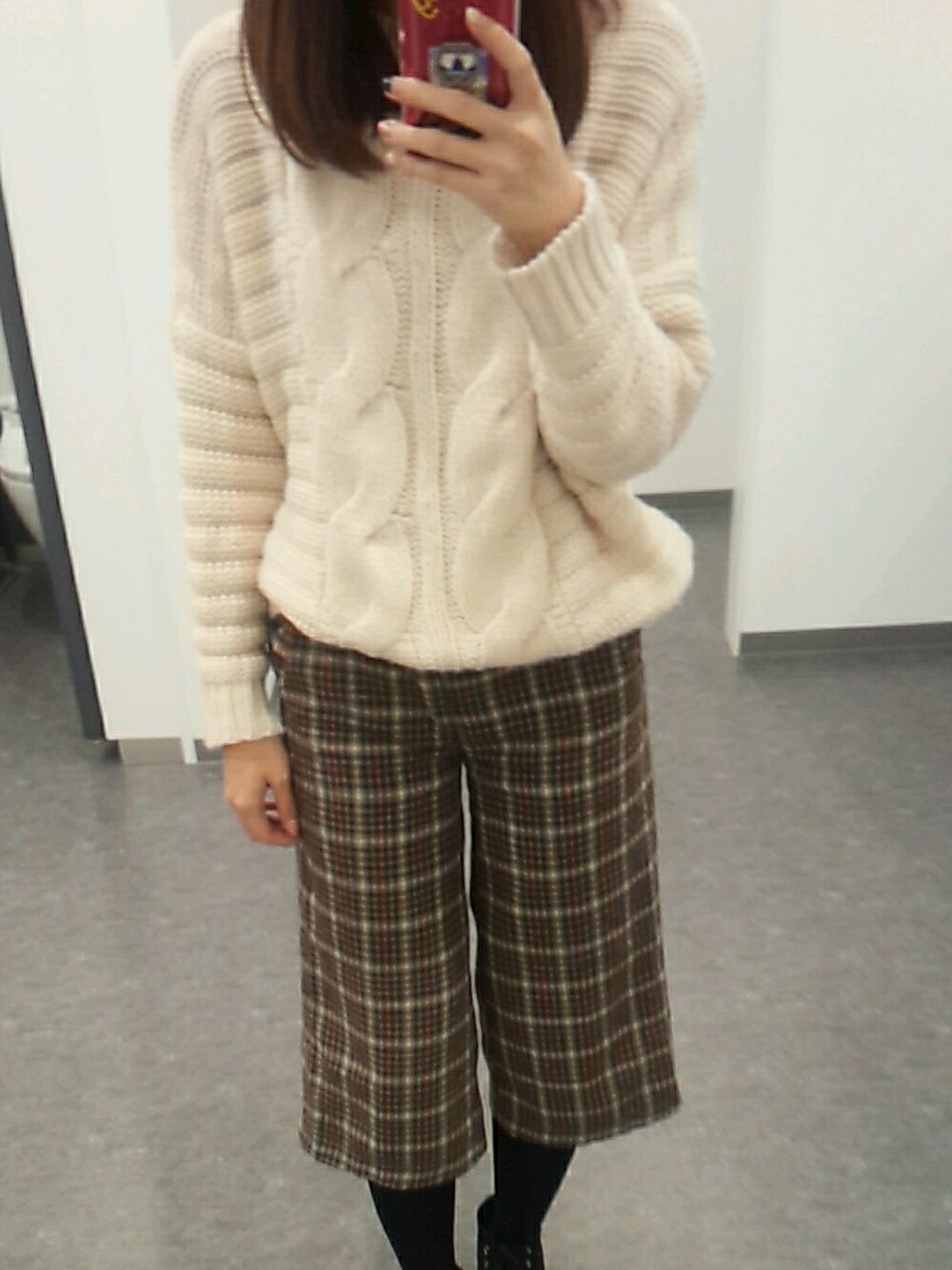 五年ぶりぐらいにはいたchattyaromaのチェックワイドパンツ! ガウチョなのかな?(笑) ここ五年ですこし痩せたのかシルエットがかわってびっくり(^-^;) アリエスミラージュのこのアラン編みニットはケーブルニットラブの私にはかなりお気に入り♡ スニーカーコーデで歩きやすさ重視!