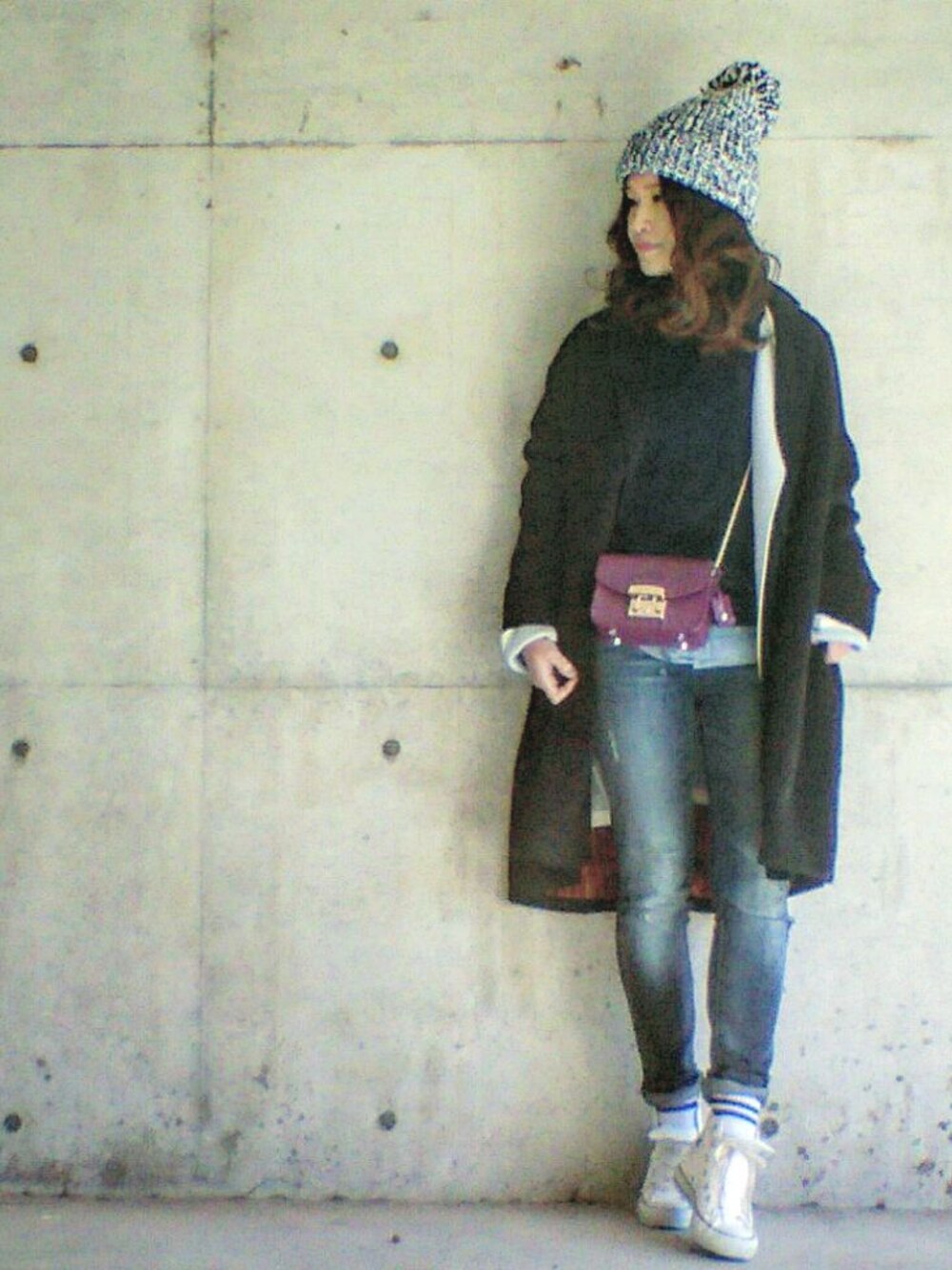 寒かった日の重ね着しまくり 着ぶくれコーデ チェスターコートの中にコーディガン着てます