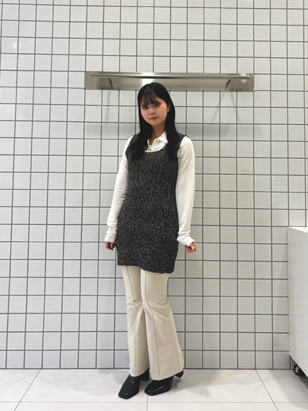 シャツ×ニットワンピのレイヤードで、こなれ感たっぷりのスタイル🖤 落ち着いた配色で大人っぽく、フレアパンツが縦ラインを強調🖤🥀 すっきり見えしつつ、きちんと感も演出できる万能コーデです☆*。