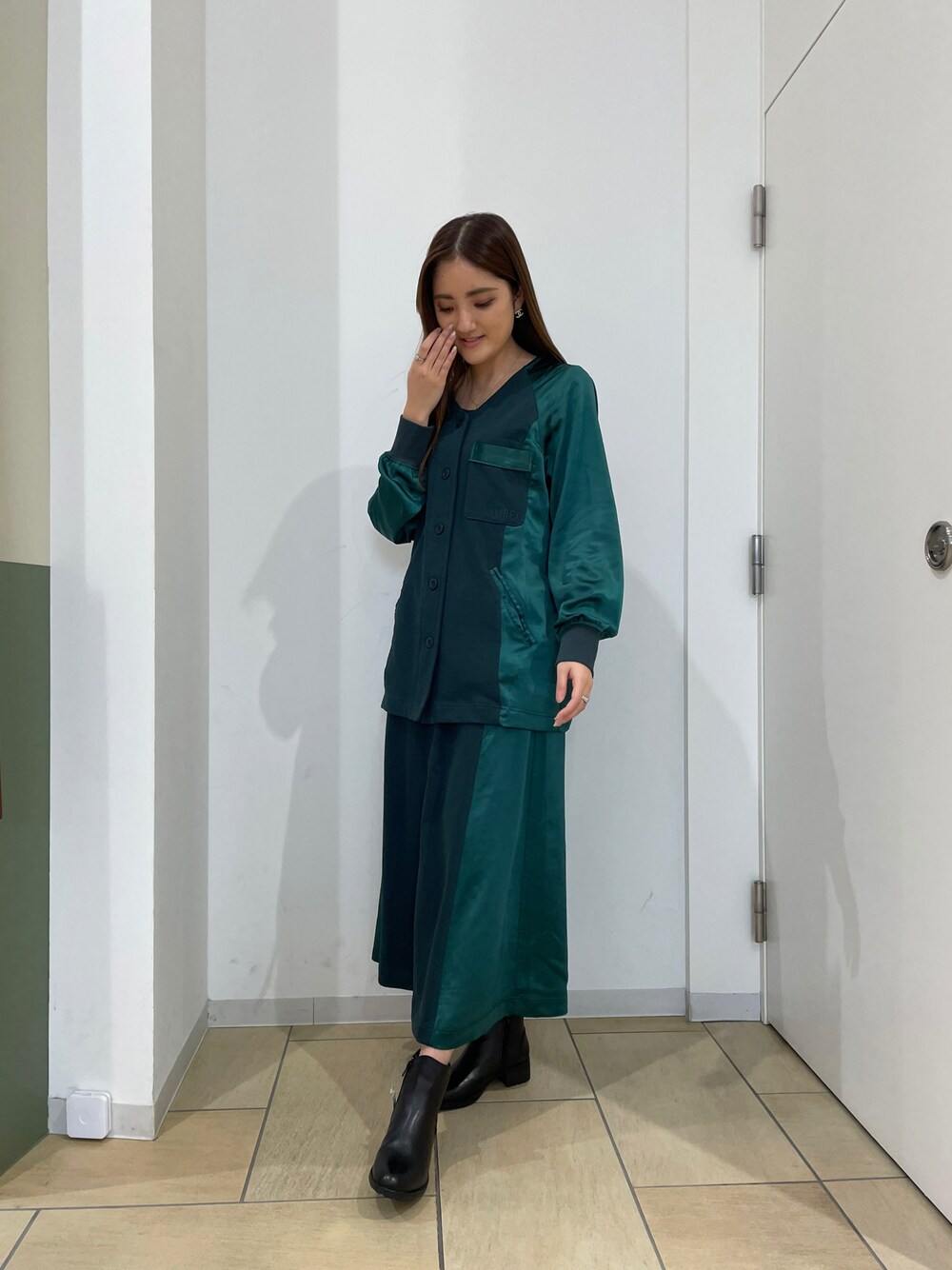 ayusaのカーディガン/ボレロ「VINTAGE SATIN RAGLAN SHIRT/ ヴィンテージサテン ラグランシャツ」を使ったコーディネート