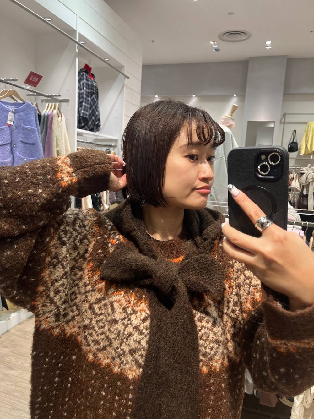 柄ニット冬におすすめ♡ 1枚で映えるよ! マフラーは今年らしいフード付き!! 首周りのポイントにもなるからおすすめ! SAKOの▶ Instagram wear