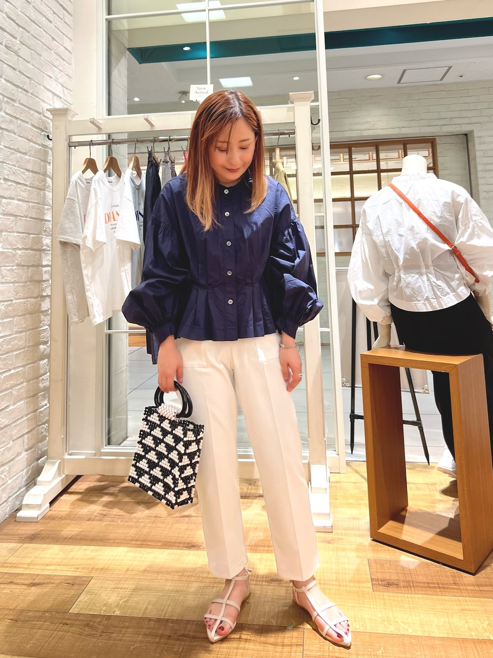 ふわっとした袖が可愛いブラウスに 細身のテーパードパンツを合わせて キレイめスタイル。