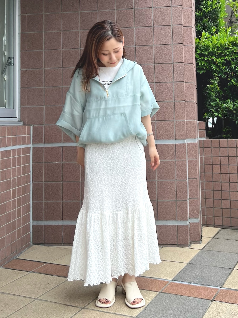 大人気のアノラックパーカー半袖バージョン、くすみブルーが可愛すぎます♪ 白スカートに合わせて大人のキレイめカジュアルコーデ♡
