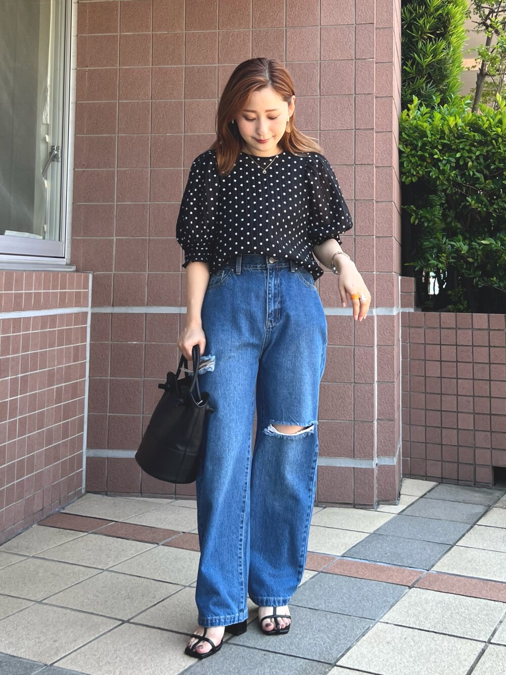 袖のシルエットが可愛いドットブラウス♡ダメージデニムと合わせて甘すぎない大人可愛いコーデ♡
