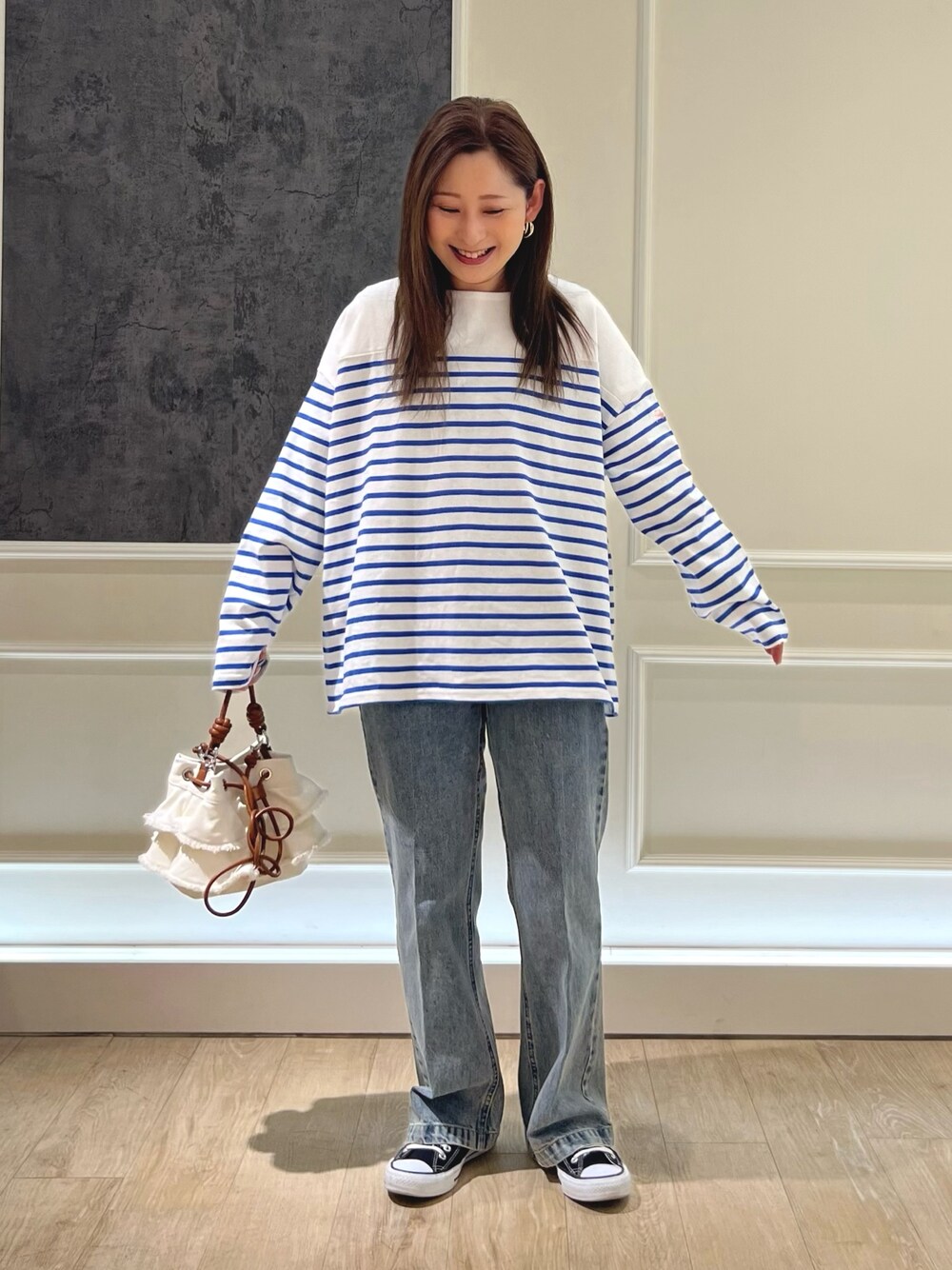 シンプルなボーダー×デニムコーデ! トップスは腰回りをカバーしてくれる長めの丈で安心◎