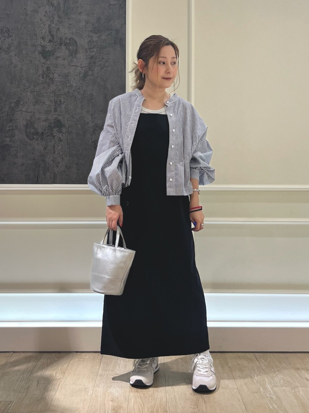 Iラインのきれいシルエットワンピースにシャツを羽織った秋のお出かけコーデ♡