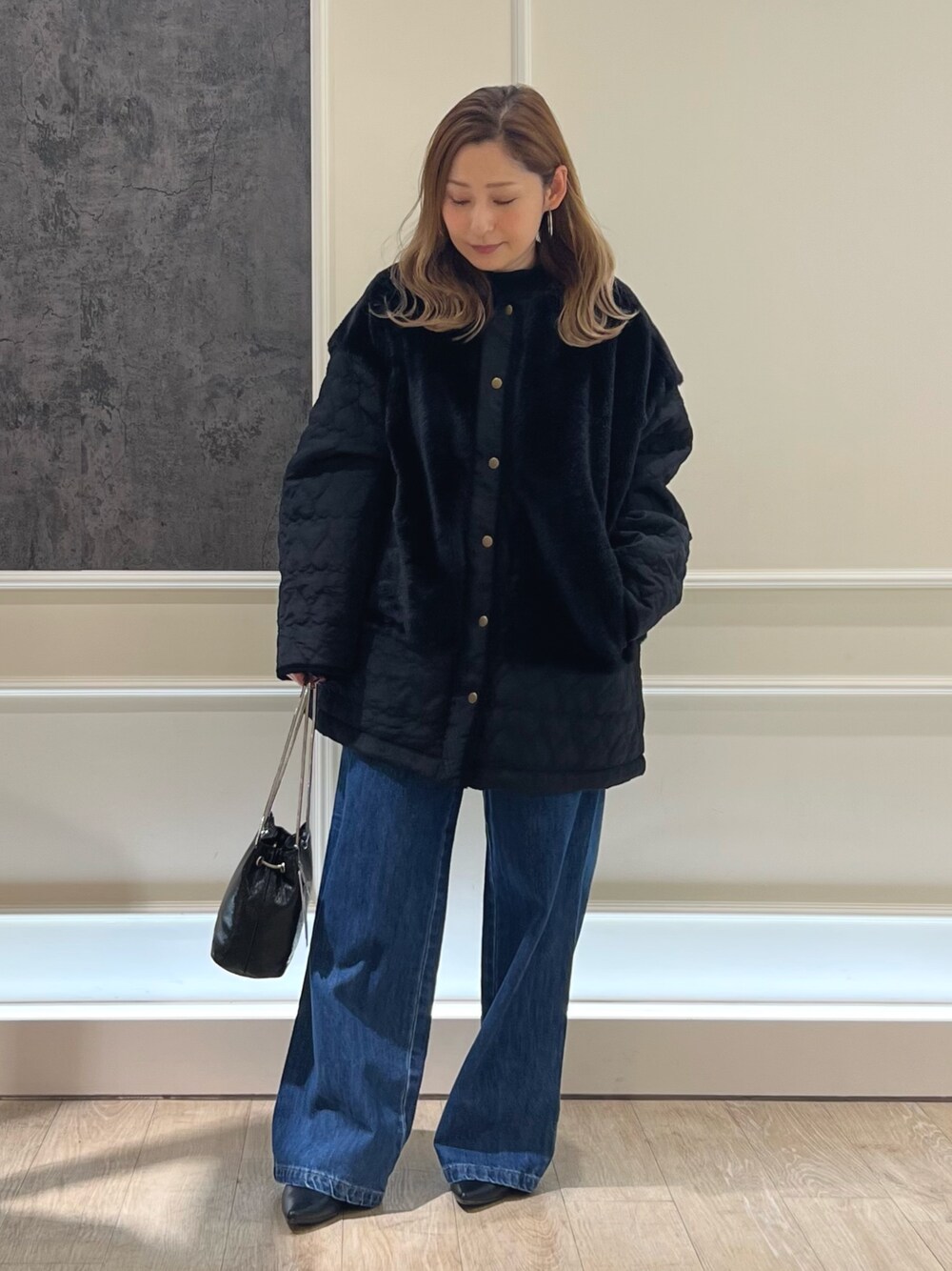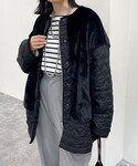 ハートのキルティングと高見えするファーが可愛いアウター。 ゆったりと着れてボリュームのあるトップスでも着膨れしません。 デニムはウエストがゴムになっているイージーパンツ。程よい太さでワイドが苦手な方も履きやすそうです。