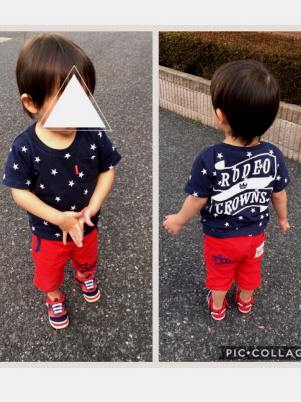 今日はとても暑かったですね🌞 息子は紺 × 赤 コーデでした。 洋服は両方去年買ったものですが ロデオクラウンズのTシャツは 親子お揃いで着れるものです。可愛い。 色違いを親子お揃いで持っています❤︎