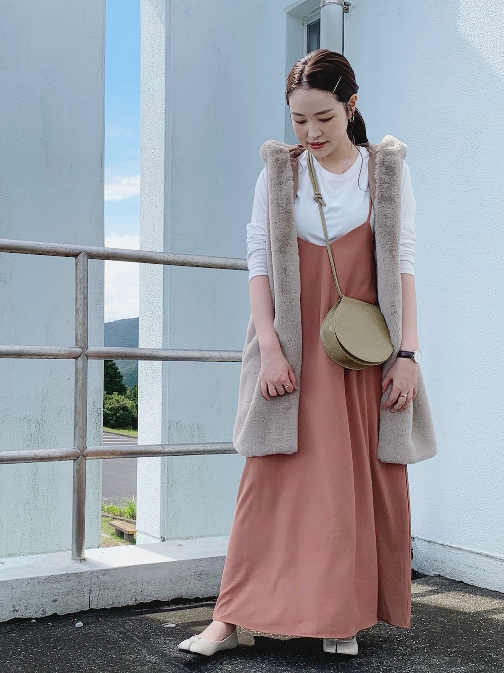 妄想コーデ🍂💭 前記事で着てたキャミワンピ** 寒くなったらこんな感じで着たいなぁ💭♥︎ 小物やベストは淡い色にして 大人フェミニンっぽく。 暑いからベストはすぐさま脱ぎました。笑 キャミワンピは中のインナー次第で オールシーズン着れるのも魅力の1つ☺️♥︎ 今ならタンクやTシャツ、 寒くなったらタートルニットなど。 体型カバーにもなるし、 マタニティーウェアにも◎ 私が着てるのはモカピンクです☕️🤍 ピンクよりのキャメルって感じかなぁ?🙄 こっくりカラーで秋色🍂 可愛いのでおすすめです☺️♥︎♥︎