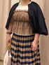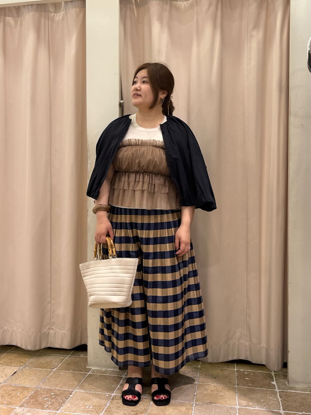 ブラウン系でまとめたワントーンコーデ✨ チュールトップスやチェックスカートといった甘めのアイテムも、色味を統一すると大人っぽく着ることができます☺️ 最初試着したものがしっくりこず、スタッフにいい感じにコーデ組み直していただきました(余談)😂