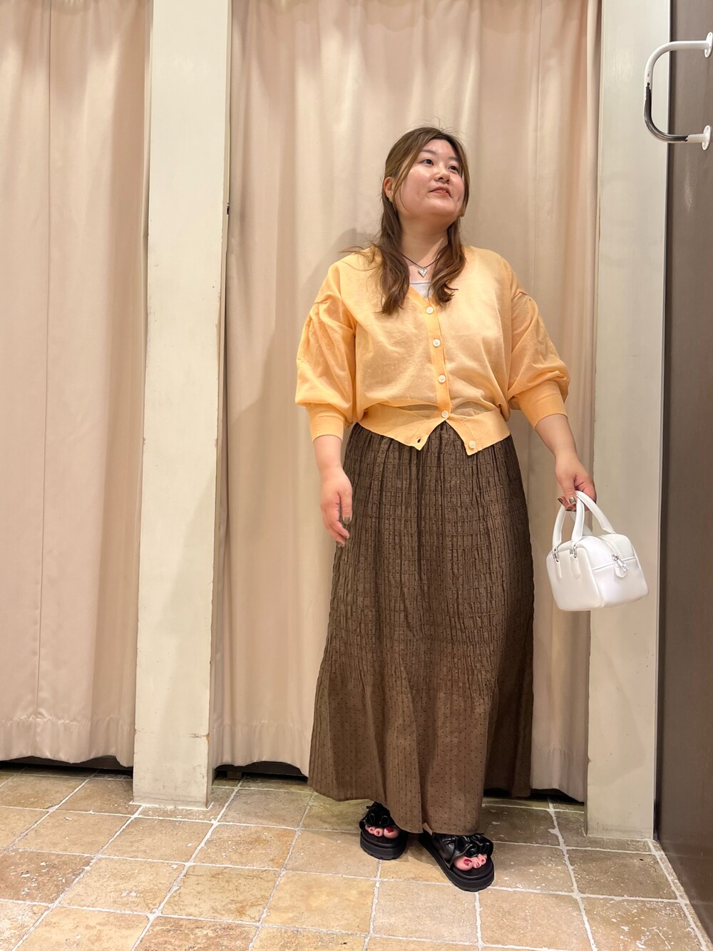 オレンジのカーディガンをポイントに🍊