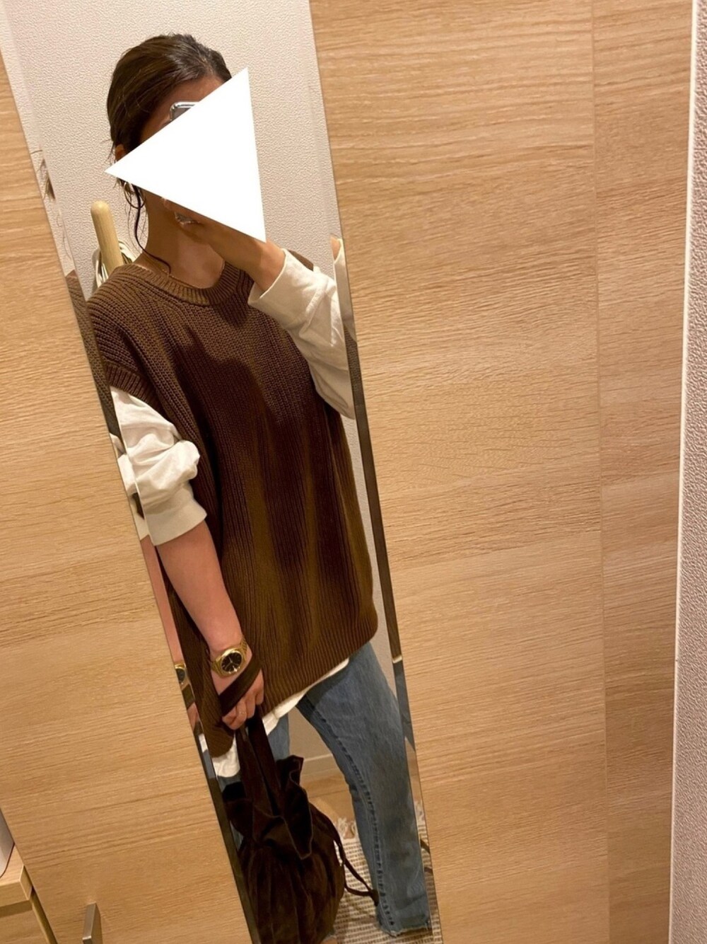 少し暖かい日のコーデ🍂 ニットベストは ユニクロのメンズXL🧶 足元は白のスクエアパンプスで🤍
