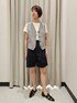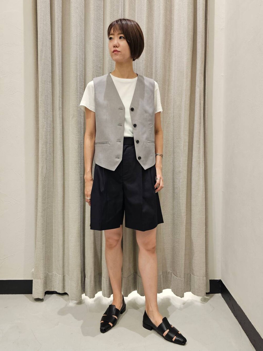 ❏ジレ❏ ショート丈の新鮮なジレ。 モノトーンでマニッシュスタイルにしても良いですし、 スカート等を合わせて雰囲気を変えられるので、ジレ好きの方はぜひ😉 コンパクトジレですが、サイズは小さ過ぎないです! 前を締めて着るとかっちり見えるので、ボタンを開けて着るともっとラフに着れます! ❏Tシャツ❏ シンプルなTシャツですが生地がさらっとしていてアイロン要らず! とても着心地がいいので、店頭でもオススメさせて頂くと皆様気に入ってくださる商品です⭐ (着やすくて私は2色買いしました😂) ❏パンツ❏ きれいめ見えするショートパンツ😊 タックが入っており、型がとても綺麗です。 短すぎない丈なので、履いて見ていけど…と言う方はぜひ挑戦してみてください✨ 厚手の素材では無いので、春〜秋まで着れます! (サンプルの為Mサイズを着用しております)