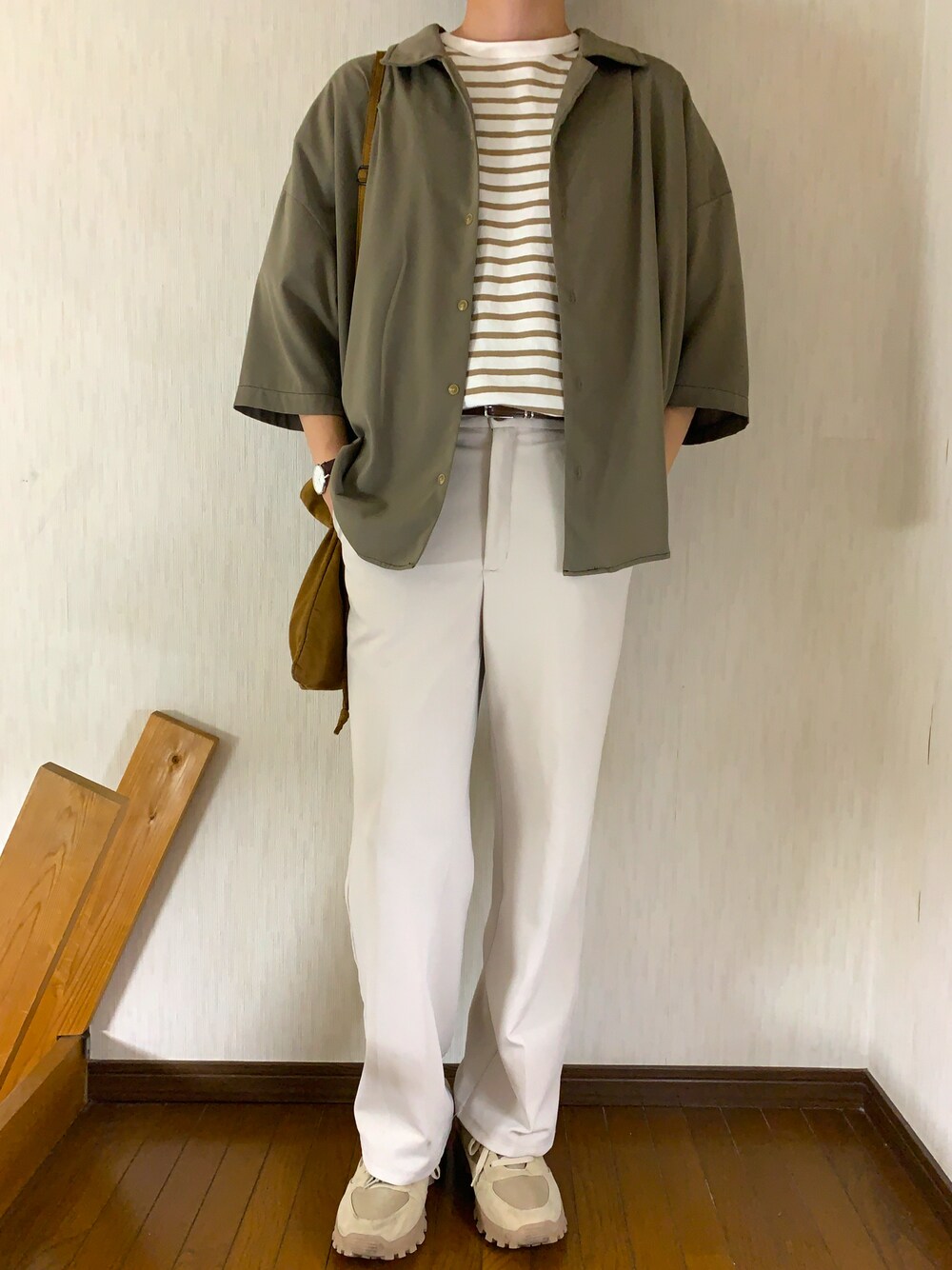 閲覧ありがとうございます! 本日はボーダーTの上にオープンカラーシャツを着たワントーンコーデになります! 靴、バッグ、時計、ベルトなどの小物もブラウンやベージュで揃えました🙆♂️ 少しでも良いと思っていただけたらいいね、お気に入りお願いします!
