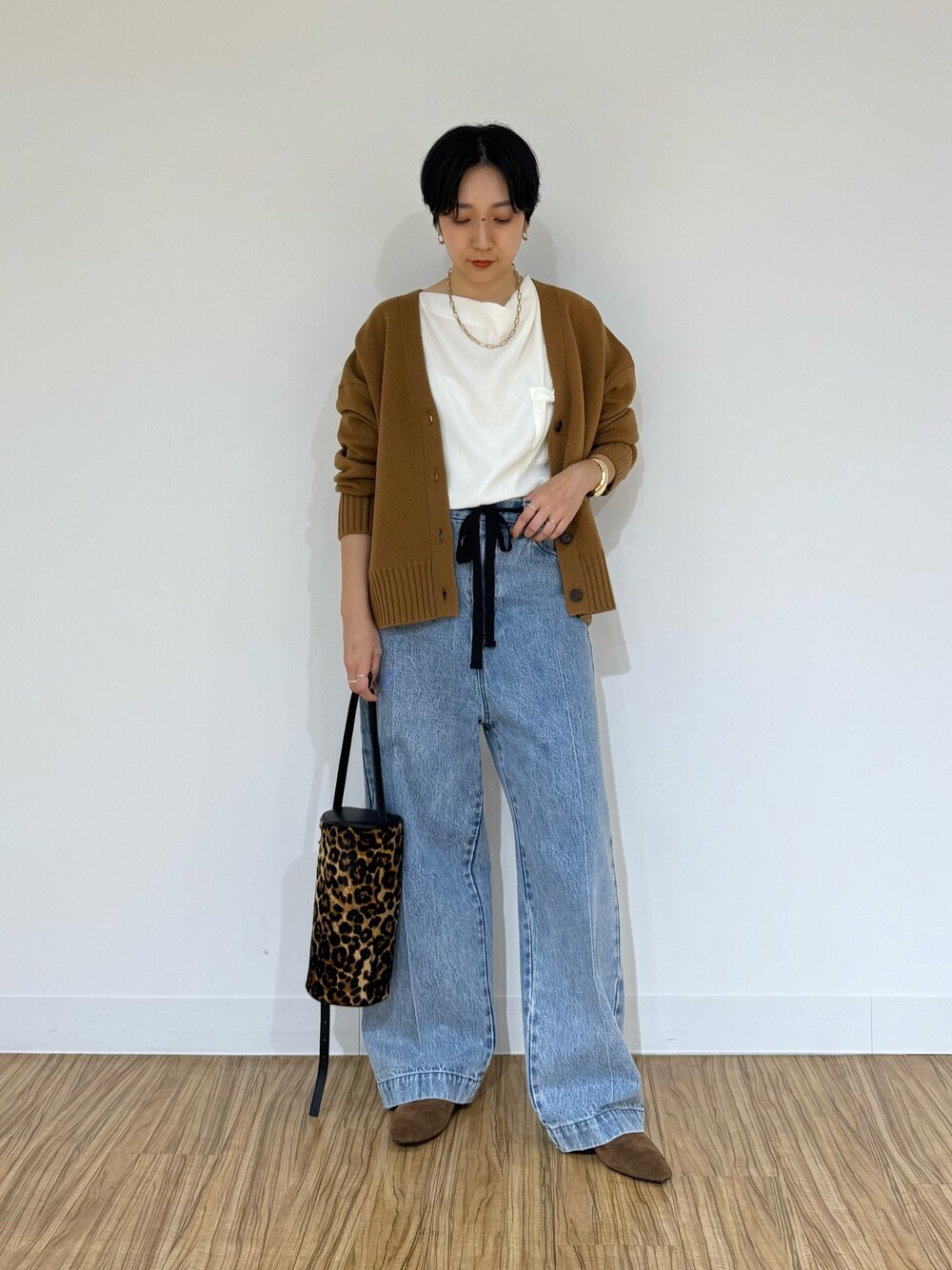 【カーディガン】 Drawing Numbersのニットカーディガンです。 ゆったりとしたサイジングでリラックス感がながら、しっかりと厚みのある生地でフォルム感がきれいに出ます。身幅が横に広いボックスシルエットが可愛く、丈感は少し短めでどんなボトムともバランスが取りやすいです。 柔らかくて肌触りも良く、素肌に着てもノンストレスでした。インナー次第でロングシーズン大活躍なアイテムです。 華やかさのあるキャメルブラウンは大人の方におすすめです◎。 【ブラウス】 フロントのドレープデザインが上品なフレンチスリーブのブラウスです。 サテンの光沢がありつつワッシャー加工でナチュラルなシワ感があり、きれいにまとまり過ぎないのもポイントです。フロントのポケットが抜け感をプラスしてくれ、一枚で着てもシンプルすぎずにサマになります。 ゆったりしたシルエットで体型カバーになるだけでなくサラッとした着心地も嬉しいです!気になる二の腕の隠れるフレンチスリーブも◎。 オンオフを選ばず夏のコーディネートに重宝すること間違いなしの万能アイテムです! 【デニムパンツ】普段サイズM〜L|着用サイズ38 ウエストに付属した紐ベルトがアクセントになるデニムパンツです。 深めの股上のワイドストレートシルエットが脚長効果抜群の一本です!センタープレス入りなのでワイドながらもすっきりと見えて、きれいめな雰囲気も演出してくれます。 私の場合38サイズでウエストは緩すぎずキツすぎず丁度良かったです。着丈はハイウエスト気味で5cmヒールや厚底サンダルなら擦らずに穿けます。ウエストを落として腰履きも出来そうです。 とても格好良く決まってカジュアルすぎず、大人におすすめのデニムです!