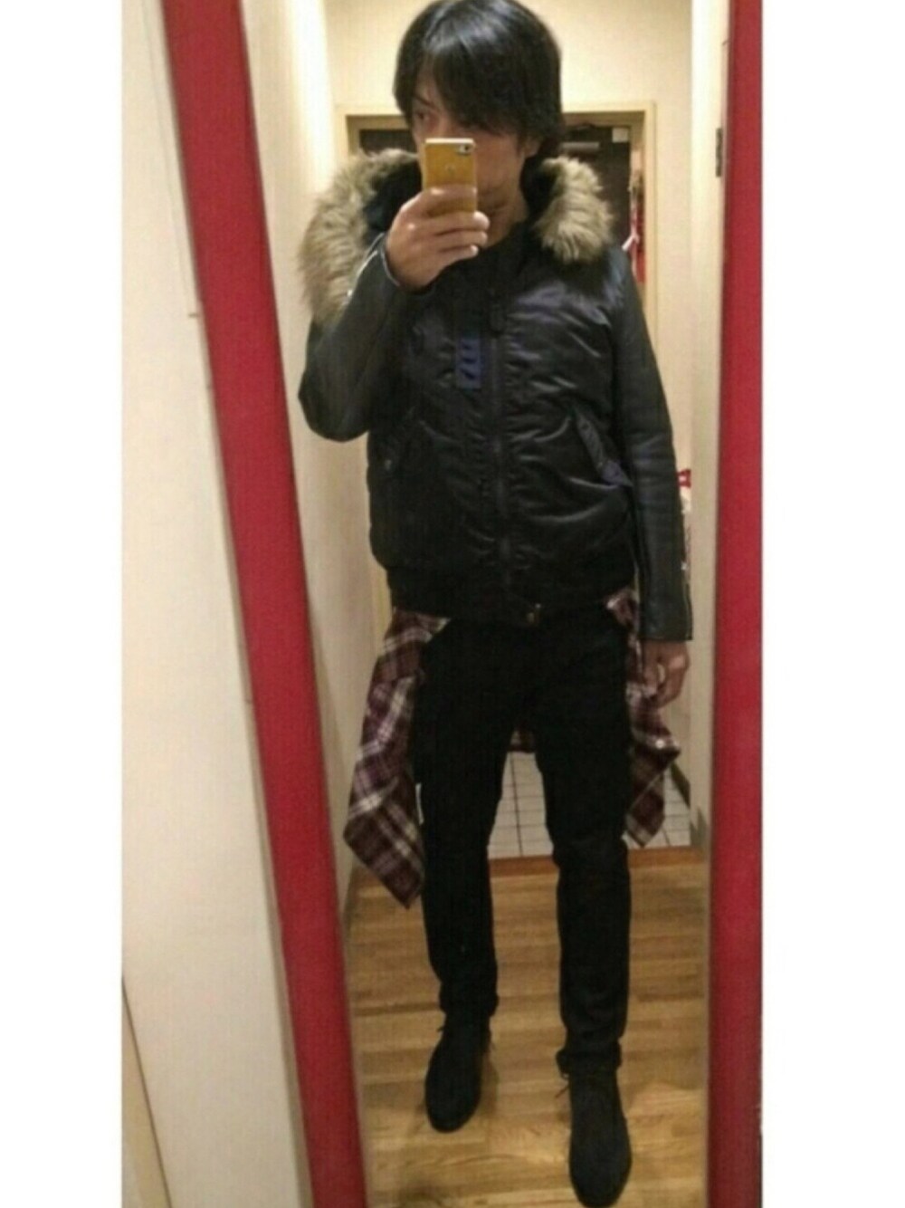 AzUのブルゾン「プリマロフトエアフォースナイロンレザースリーブフーデッドブルゾン」を使ったコーディネート