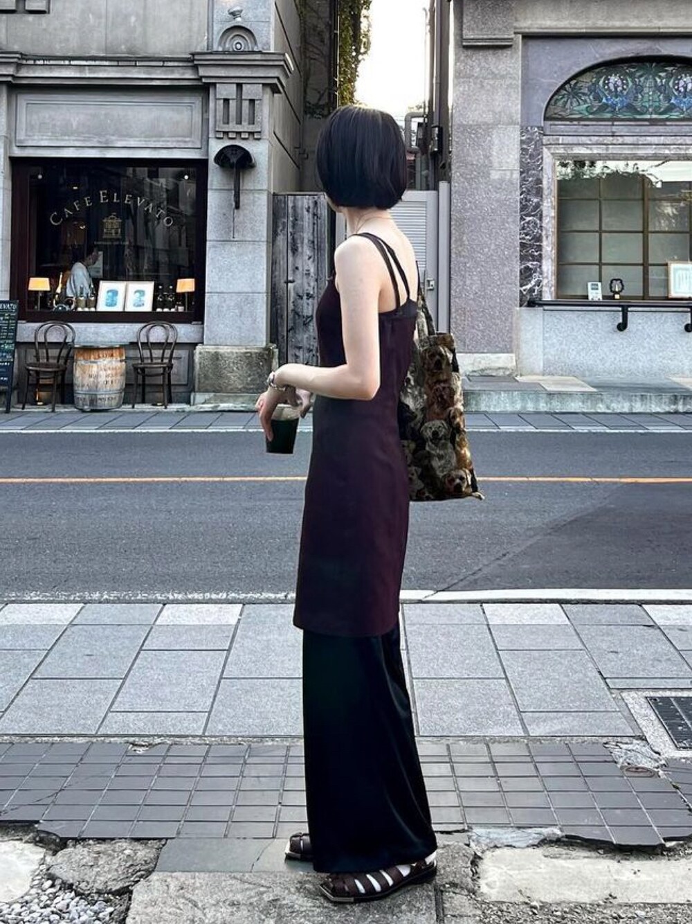 キャミワンピはどうしても露出度が高くなるのでボトムをレイヤーしてバランスを取るのが好き トートバッグはBLESSの🐶柄ジャカード