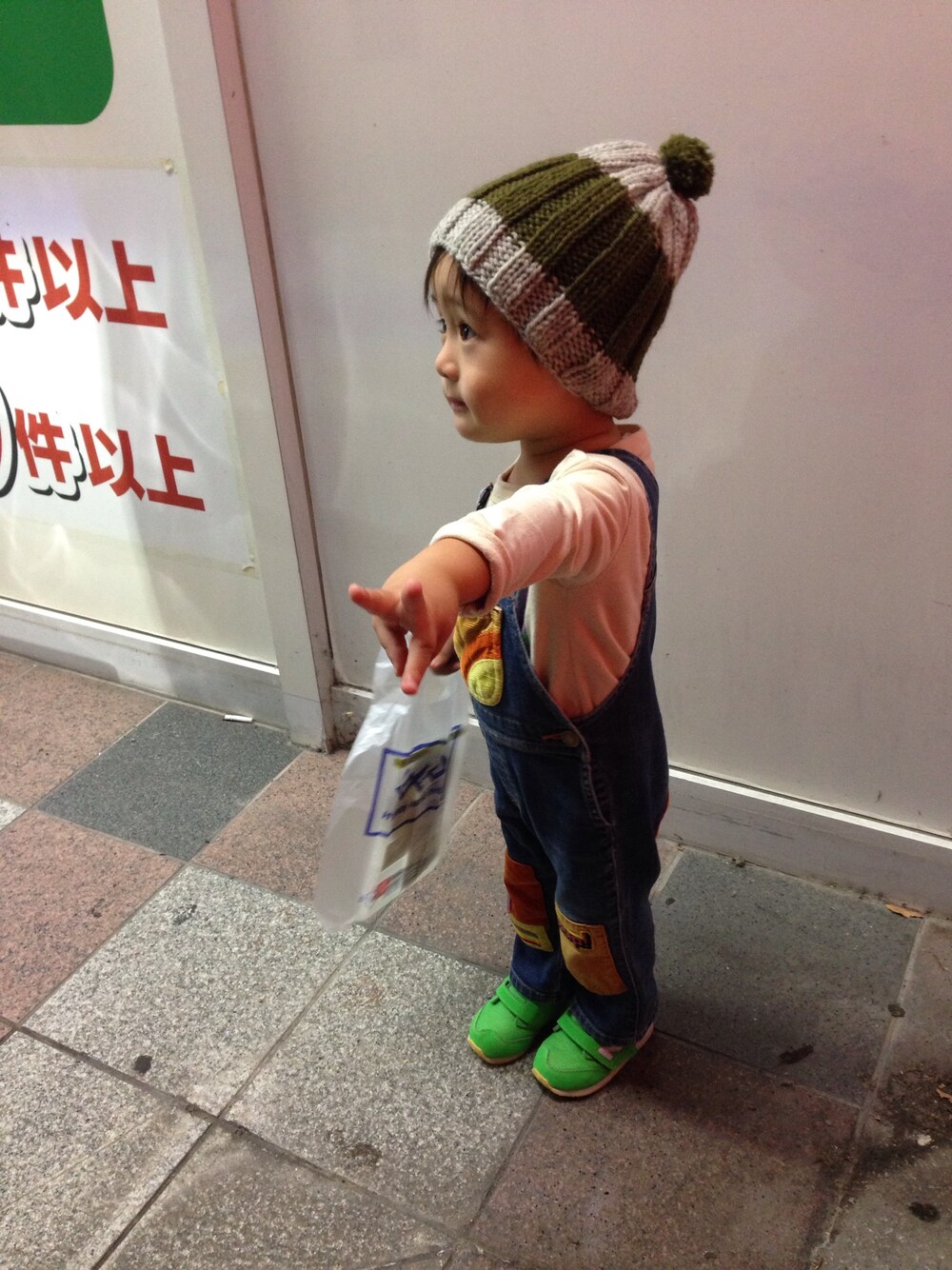 ばぁばの手編みニット帽で。 DVDレンタルでいつものお兄さんがいなくて飴もらえず…しょんぼり。。