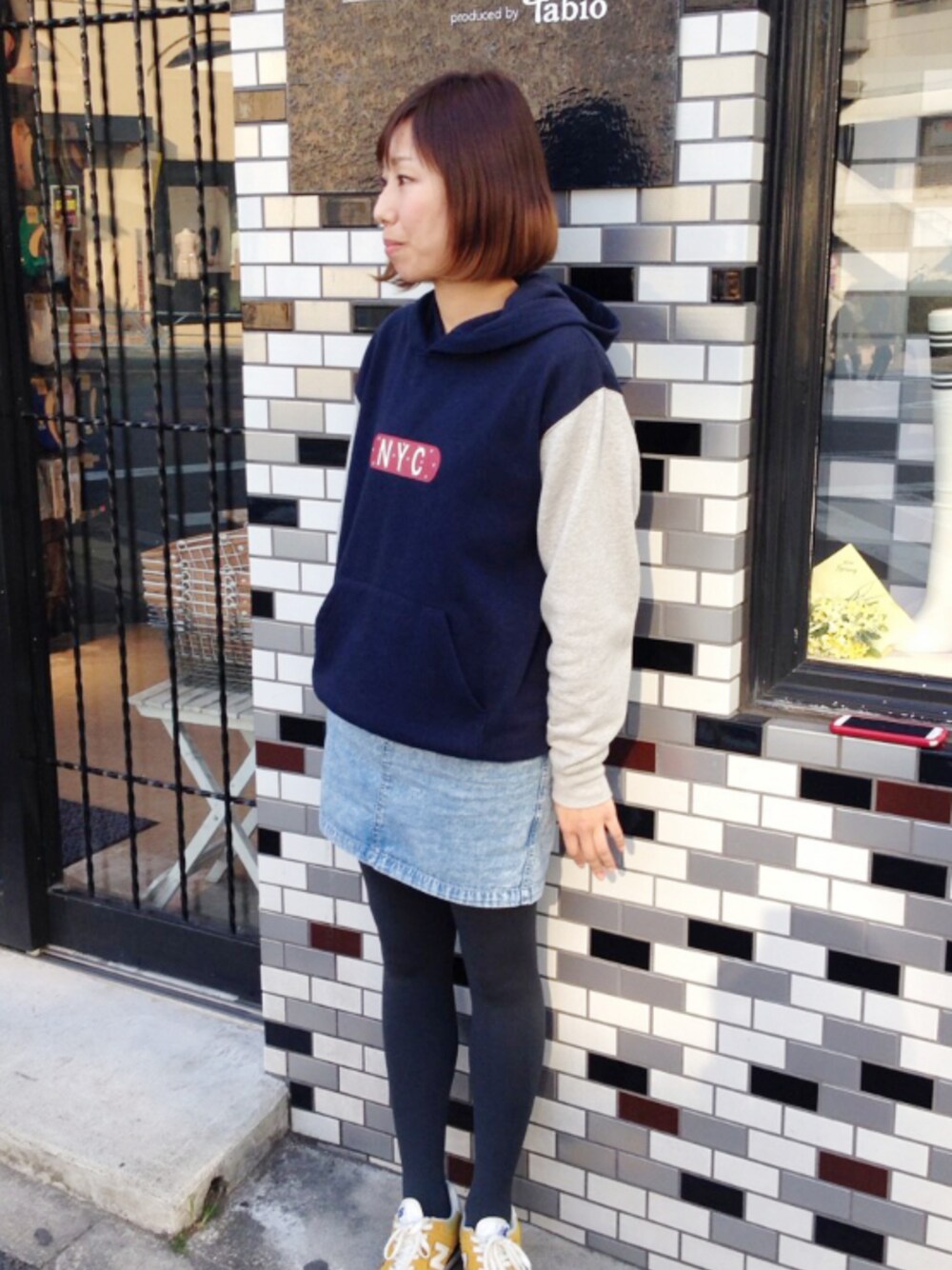 メンズのスウェットとスニーカーで今日はボーイッシュなコーディネートに。イエローのスニーカーなので、クロのタイツではちょっときつい印象になりそうかなと思いチャコールグレータイツを着用しました。